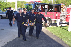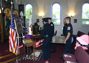 The memorial which is piece of one of the beams from the World Trade Center was brought to St Luke by an honor guard comprised of local firefighters and policemen. Below are a series of scenes as the memorial is placed in the church. Why a piece of the tower? (See Father Harrison’s Article in the Summer 2002 Evangelist.)